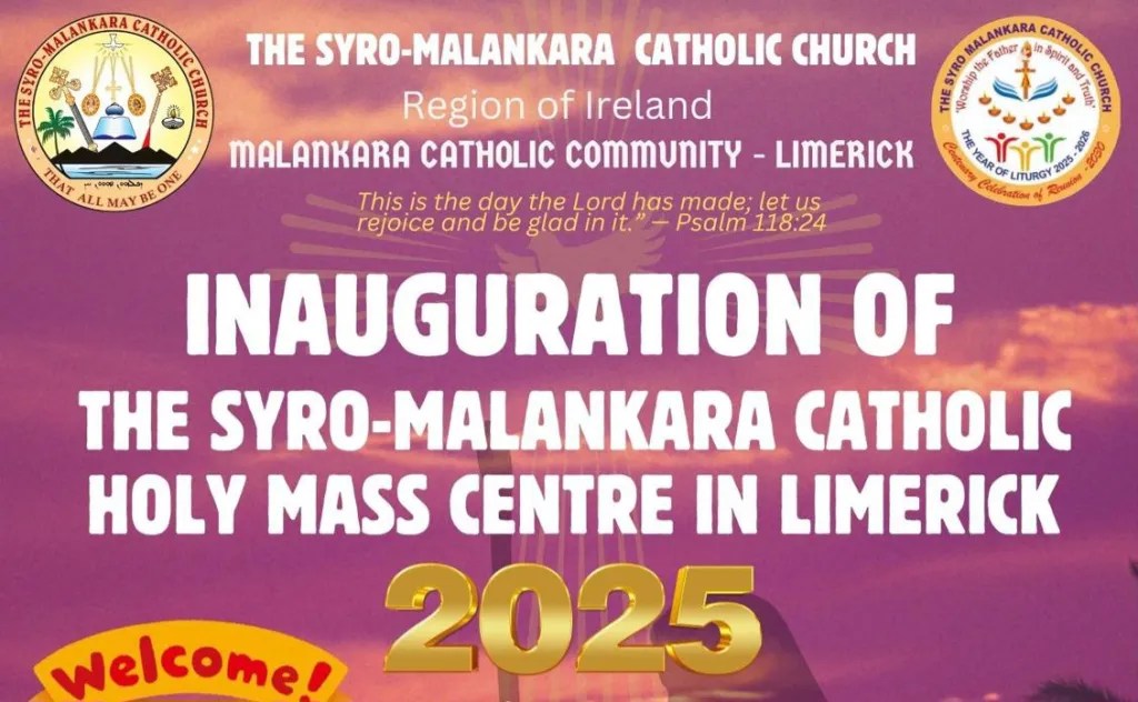 ലിമറിക്ക് മലങ്കര കത്തോലിക്ക കമ്മ്യൂണിറ്റിക്കു വേണ്ടിയുള്ള പുതിയ Mass Centre-ന്റെ ഔദ്യോഗിക ഉദ്ഘാടനം 2025 നവംബർ 22 ശനിയാഴ്ച Limerick City-യിലുള്ള St. Nicholas ദൈവാലയത്തിൽ (EircodeV94C940) നടത്തപ്പെടുന്നു. രാവിലെ 10.30-ന് വിശുദ്ധകുർബാനയോടെ പരിപാടികൾ ആരംഭിക്കും. ലിമറിക്ക് മലങ്കര കമ്മ്യൂണിറ്റിക്ക് പിന്തുണ നൽകിവരുന്ന ഏവർക്കും നന്ദിയറിയിക്കുന്നതായും, പരിപാടിയിലേയ്ക്ക് എല്ലാവരെയും സ്വാഗതം ചെയ്യുന്നതായും പ്രീസ്റ്റ് ഇൻ ചാർജ് ആയ Fr.Jovakim Pandaramkudiyil അറിയിച്ചു.